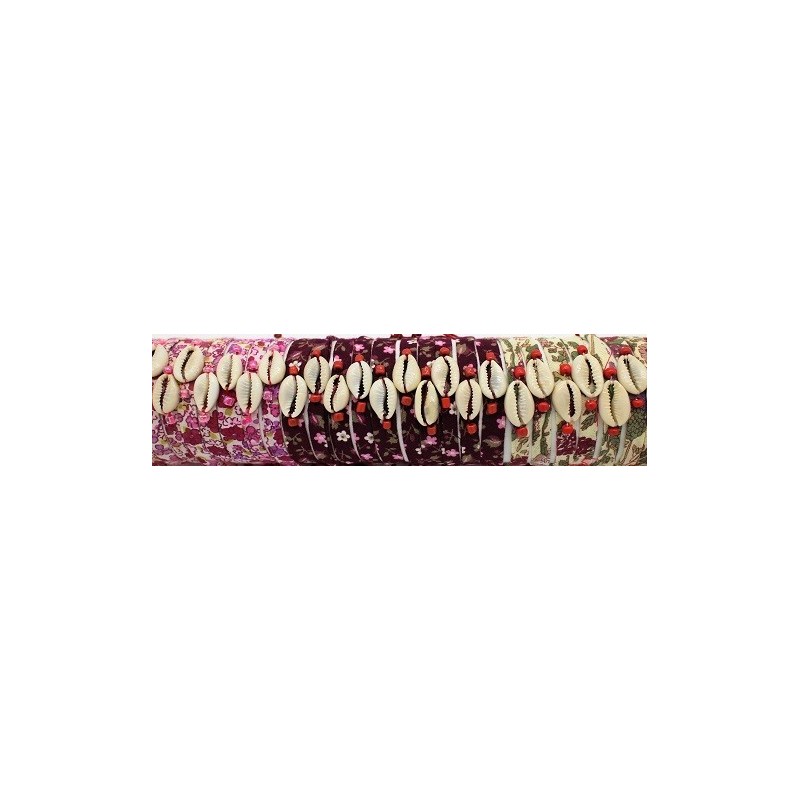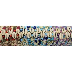 Bracelet en tissu style "liberty" avec cauri. Ajustement avec nœud coulissant. Tube de 40 pièces.